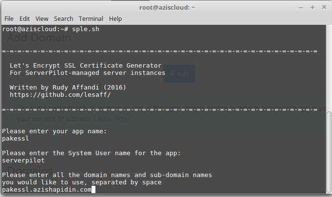 Setelah itu, jalankan juga perintah sudo chmod +x sple.sh agar sple.sh bisa di eksekusi (executable). Kemudian ketikan sple.sh di terminal Anda. Kita akan dimintai beberapa informasi tentang apps yang akan kita pasang SSL.