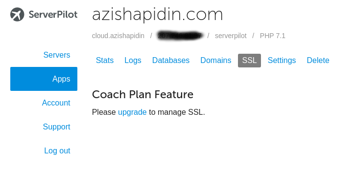 Permasalahan baru pun ditemukan, yaitu pada SSL. Ternyata untuk versi Free tidak bisa memasang SSL lewat Panel ServerPilot-nya. kalau di webhosting yang biasa kan enak, tinggal klak-klik di cPanel nya saja langsung jadi https deh. Setelah nyoba cari-cari di forum dan artikel artikel, akhirnya saya menemukan ada beberapa cara agar website kita bisa menggunakan SSL di ServerPilot: