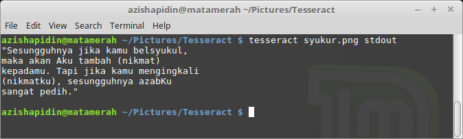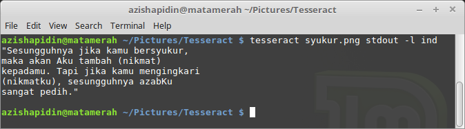 Sekarang kita coba baca gambar syukur.png tadi menggunakan Tesseract tapi dengan tambahan parameter -l ind dibelakangnya.