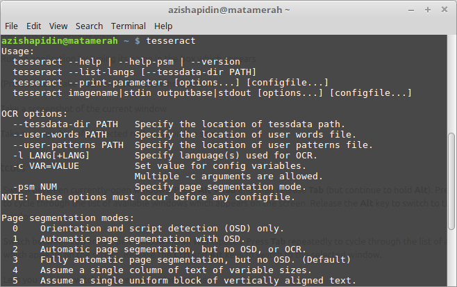 Setelah itu untuk memastikan bahwa Tesseract berhasil terpasang, silahkan jalankan perintah tesseract di Terminal, jika tampilan kurang lebih seperti dibawah berarti Tesseract sudah berhasil di-install.