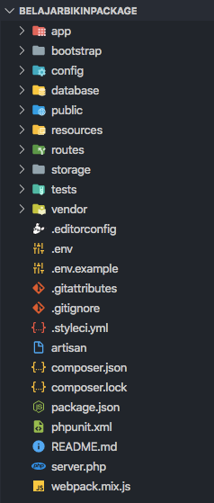 Setelah selesai maka kita akan mendapat 1 project fresh Laravel dengan struktur kurang lebih seperti ini: