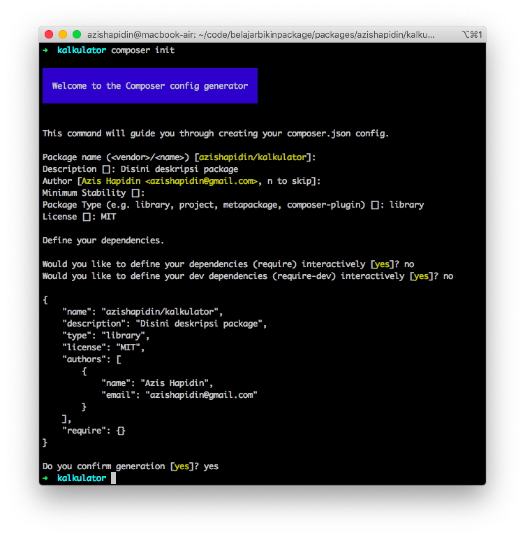 Selanjutnya kita harus membuat file composer.json pada direktori kalkulator tadi dengan menjalankan composer init, silahkan diisi sesuai keinginan teman-teman.