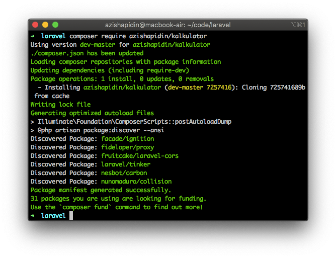 Sebelum ngetes, karena package kita masih berada di direktori packages, kita tambahkan dulu beberapa baris pada file composer.json di project laravel kita (bukan file composer.json yang package). Pada bagian psr-4 di autoload tambahkan "AzisHapidin\Kalkulator\": "packages/azishapidin/kalkulator/src". Kurang lebih jadinya seperti ini (perhatikan baris ke 7):