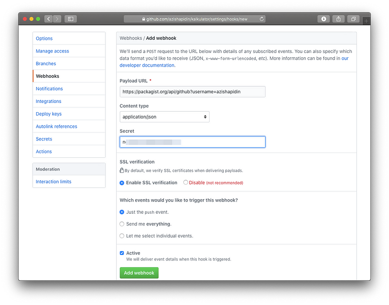 Setelah itu klik Add webhook, sampai sini jika tidak ada masalah maka warning tadi harusnya sudah hilang, GitHub akan otomatis mengirimkan Hook ke Packagist ketika ada push (agar di Packagist ikut terupdate).