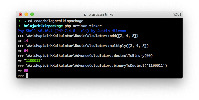 Yosh, sampai sini berarti package yang kita buat sudah bekerja dengan baik. Jika temen-temen mau test yang lebih simple bisa juga test lewat php artisan tinker seperti dibawah: