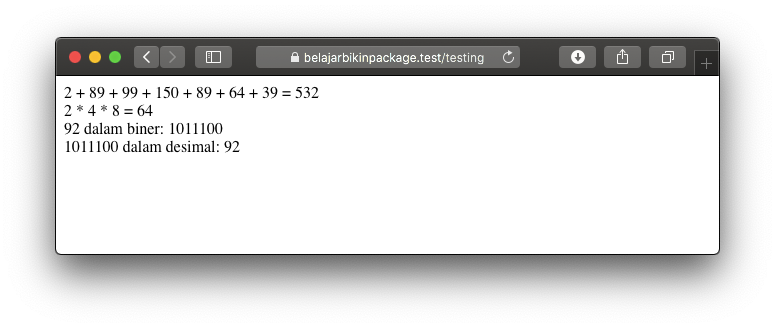 Setelah itu silahkan jalankan: composer dump-autoload, selanjutnya untuk mengetes class yang ada di package diatas cara paling mudah adalah kita panggil di route. Pada routes/web.php silahkan tambahkan ini: