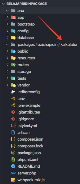 Selanjutkanya kita buat direktori packages pada direktori utama project Laravel kita. Kemudian di dalam packages tersebut kita buat direktori package yang kita akan buat dengan format: namavendor/namapackage. Jadi jika nama vendor-nya adalah azishapidin dan nama package-nya adalah kalkulator, maka strukturnya akan seperti ini: