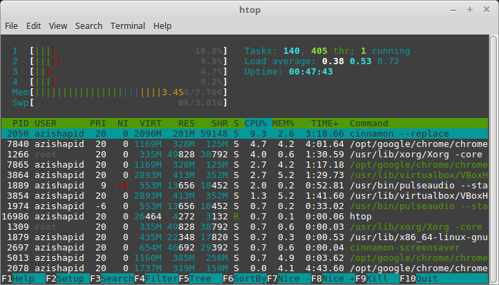 Untuk membukanya kita tinggal menjalankan command htop di terminal, maka akan muncul interface seperti screenshot diatas. Untuk kill process, kita cukup pilih process kemudian tekan F9.
