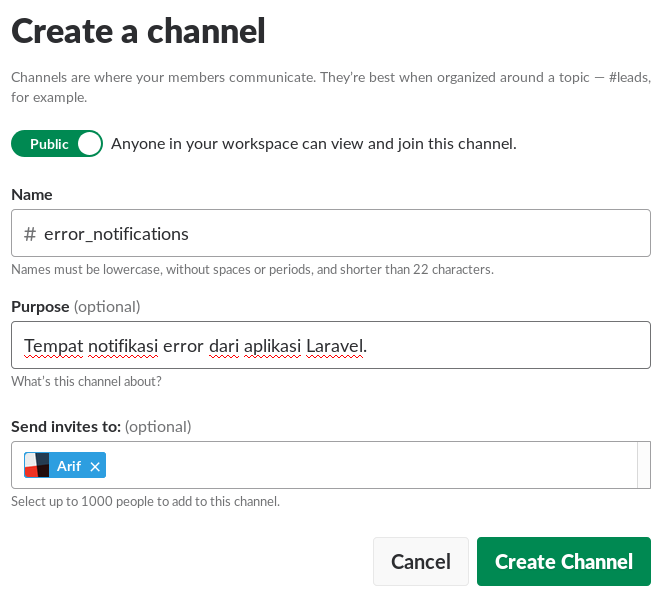Kemudian kita masukan informasi Channel-nya mulai dari pengaturan apakah publik atau tidak, nama channel, deskripsi dan juga orang yang ingin diundang masuk ke Channel. Sebagai contoh disini saya memasukan Arif sebagai member.