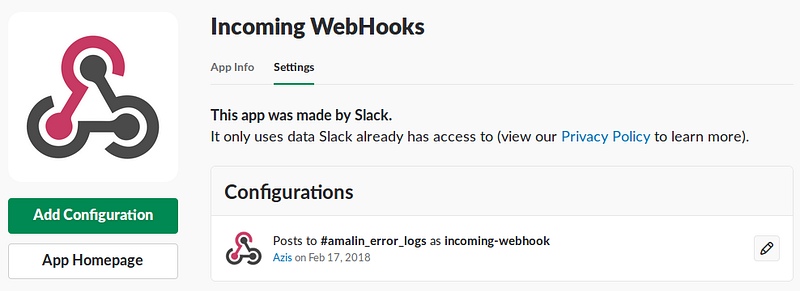 Kemudian dikolom pencarian cari Incoming WebHooks kemudian klik Add Configuration.