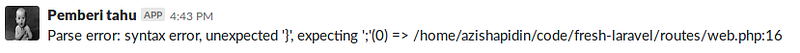 Setelah itu coba buat sebuah error di project Laravel kita, contoh disini saya sengaja menghapus titik koma (;) pada routes/web.php, maka ketika web dibuka maka otomatis akan ada notifikasi di Slack kurang lebih seperti ini: