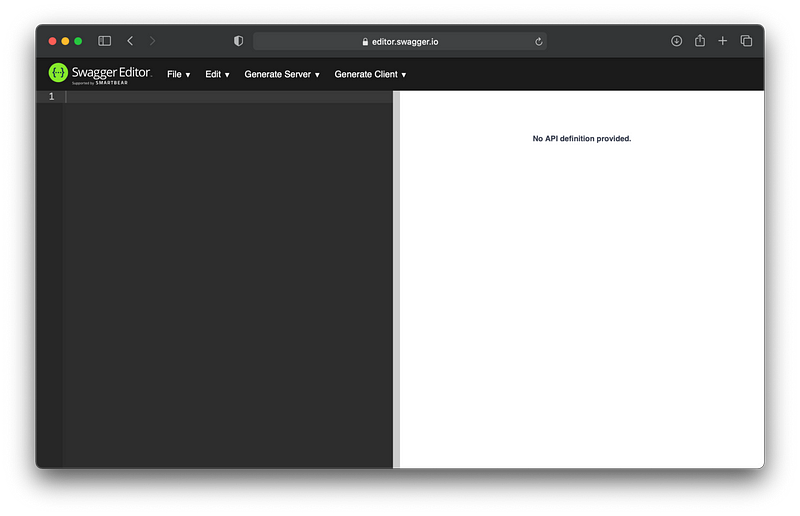 Oke langkah pertama adalah kita harus membuat sebuah OpenAPI Document terlebih dahulu, untuk mempermudah bagian ini kita akan menggunakan tools Swagger Editor, kita cukup menuliskan kode di kolom sebelah kiri maka hasilnya akan langsung muncul di kolom sebelah kanan.