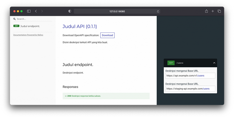 Lebih lengkapnya terkait redoc-cli bisa cek di halaman ini: https://github.com/Redocly/redoc/blob/master/cli/README.md