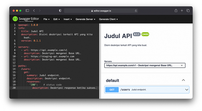 Untuk memastikan kode diatas berjalan, silahkan copy kode diatas lalu paste pada Swagger Editor tadi, maka hasilnya kurang lebih akan seperti ini: