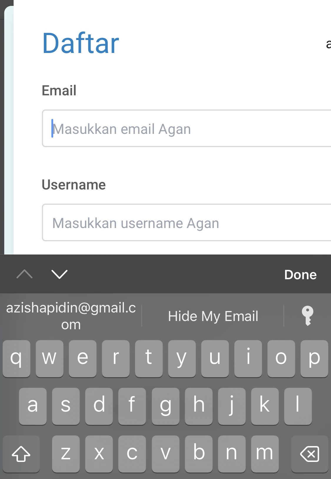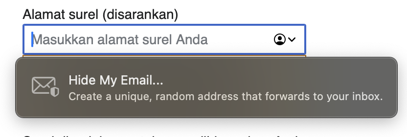 Saat kita melakukan registrasi pada halaman web, maka kita akan secara otomatis ditawarkan untuk menggunakan Hide My Email: