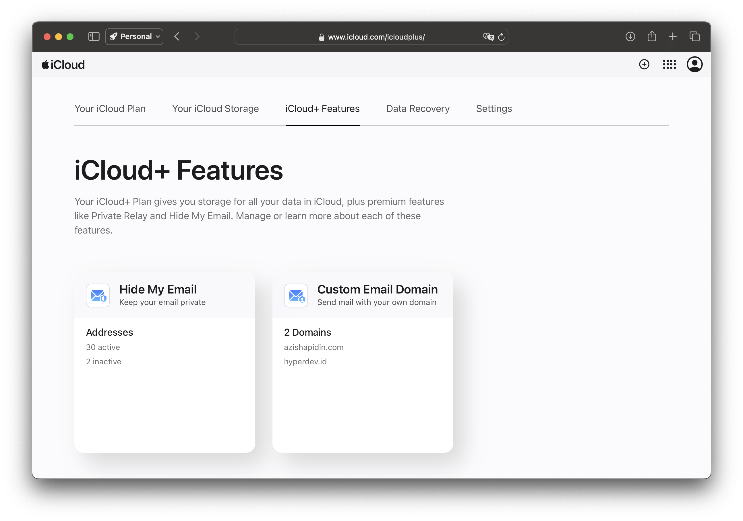 Atau kita juga bisa masuk melalui dashboard web melalui https://www.icloud.com/icloudplus/ lalu klik menu Hide My Email.